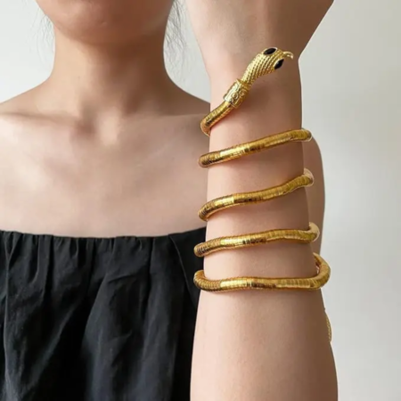 The jewelry features a unique snake shape design with a textured, scale-like finish and black eyes on the snake head.Material and Finish: