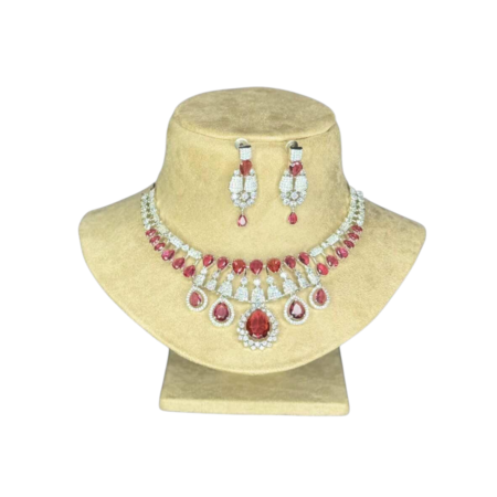 Stones: The set is adorned with sparkling white American Diamonds (cubic zirconia) and features prominent drop accents.Polishes: Rhodium Plated