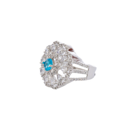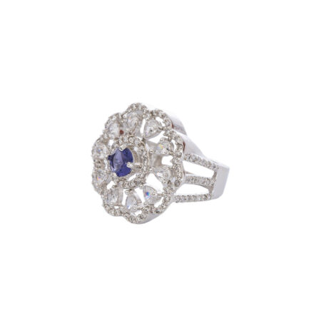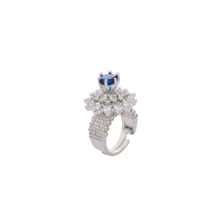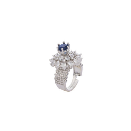 It features a cocktail or cluster design, with the central Sapphire Blue stone encircled by a halo of sparkling clear American Diamonds, creating a prominent and eye-catching appearance. The band may also be studded with American Diamonds for added sparkle.Materials: