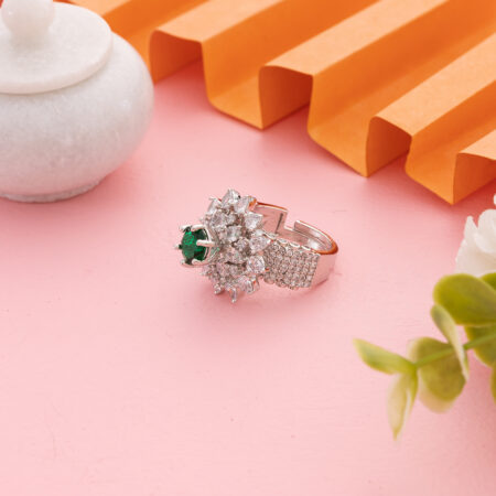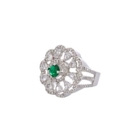 It features a cocktail or cluster design, with the central green stone encircled by a halo of sparkling clear American Diamonds, creating a prominent and eye-catching appearance. The band may also be studded with American Diamonds for added sparkle.Materials: