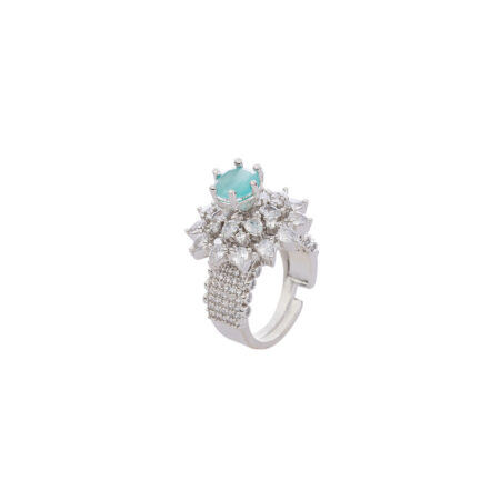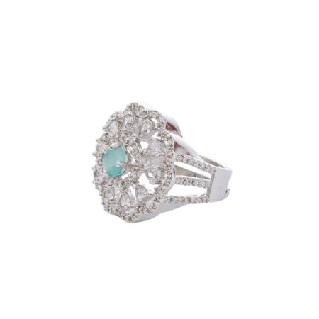 It features a cocktail or cluster design, with the central Pastel Green stone encircled by a halo of sparkling clear American Diamonds, creating a prominent and eye-catching appearance. The band may also be studded with American Diamonds for added sparkle.Materials: