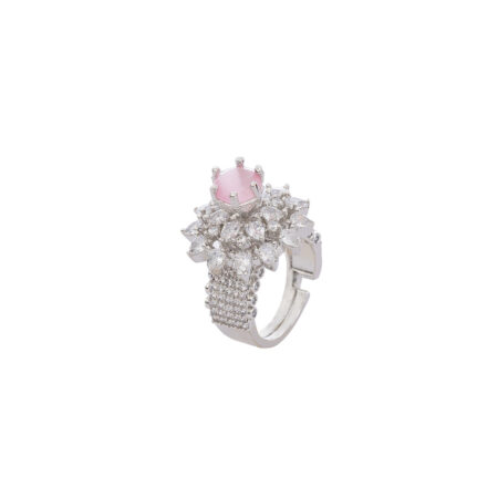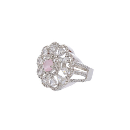 It features a cocktail or cluster design, with the central Pastel Pink stone encircled by a halo of sparkling clear American Diamonds, creating a prominent and eye-catching appearance. The band may also be studded with American Diamonds for added sparkle.Materials: