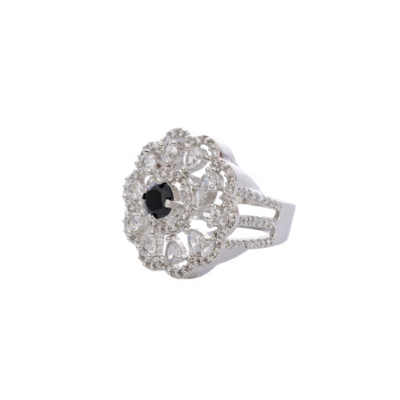It features a cocktail or cluster design, with the central Black stone encircled by a halo of sparkling clear American Diamonds, creating a prominent and eye-catching appearance. The band may also be studded with American Diamonds for added sparkle.Materials:
