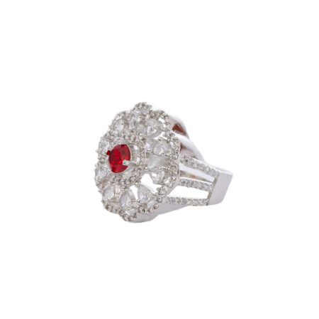 It features a cocktail or cluster design, with the central Ruby Red stone encircled by a halo of sparkling clear American Diamonds, creating a prominent and eye-catching appearance. The band may also be studded with American Diamonds for added sparkle.Materials: