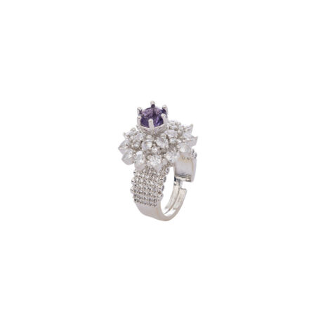It features a cocktail or cluster design, with the central Lavender stone encircled by a halo of sparkling clear American Diamonds, creating a prominent and eye-catching appearance. The band may also be studded with American Diamonds for added sparkle.Materials: