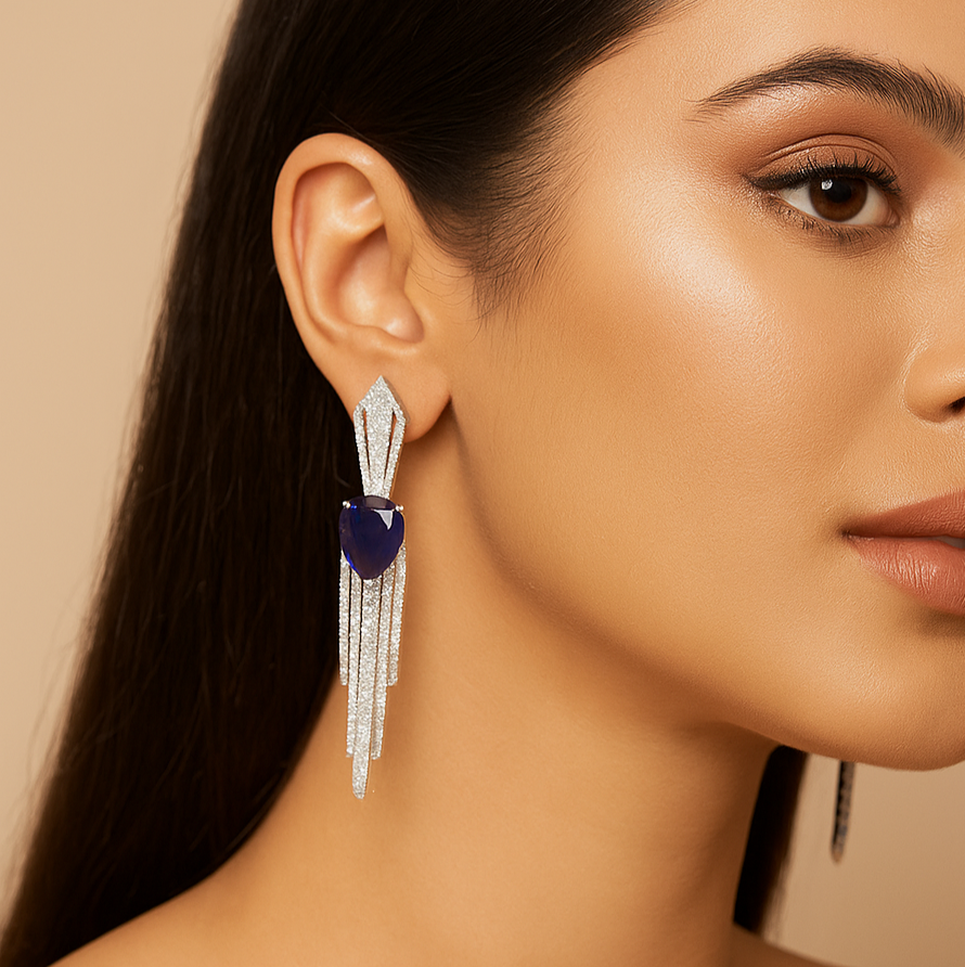 It features a unique and romantic design, described as a drop earring with a prominent Lavender gemstone (Cubic Zirconia) and intricate detailing with what appears to be high carbon diamonds or rhinestones.