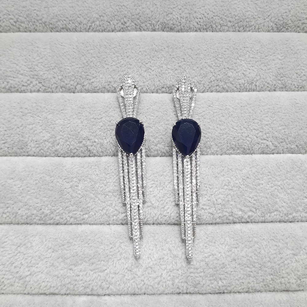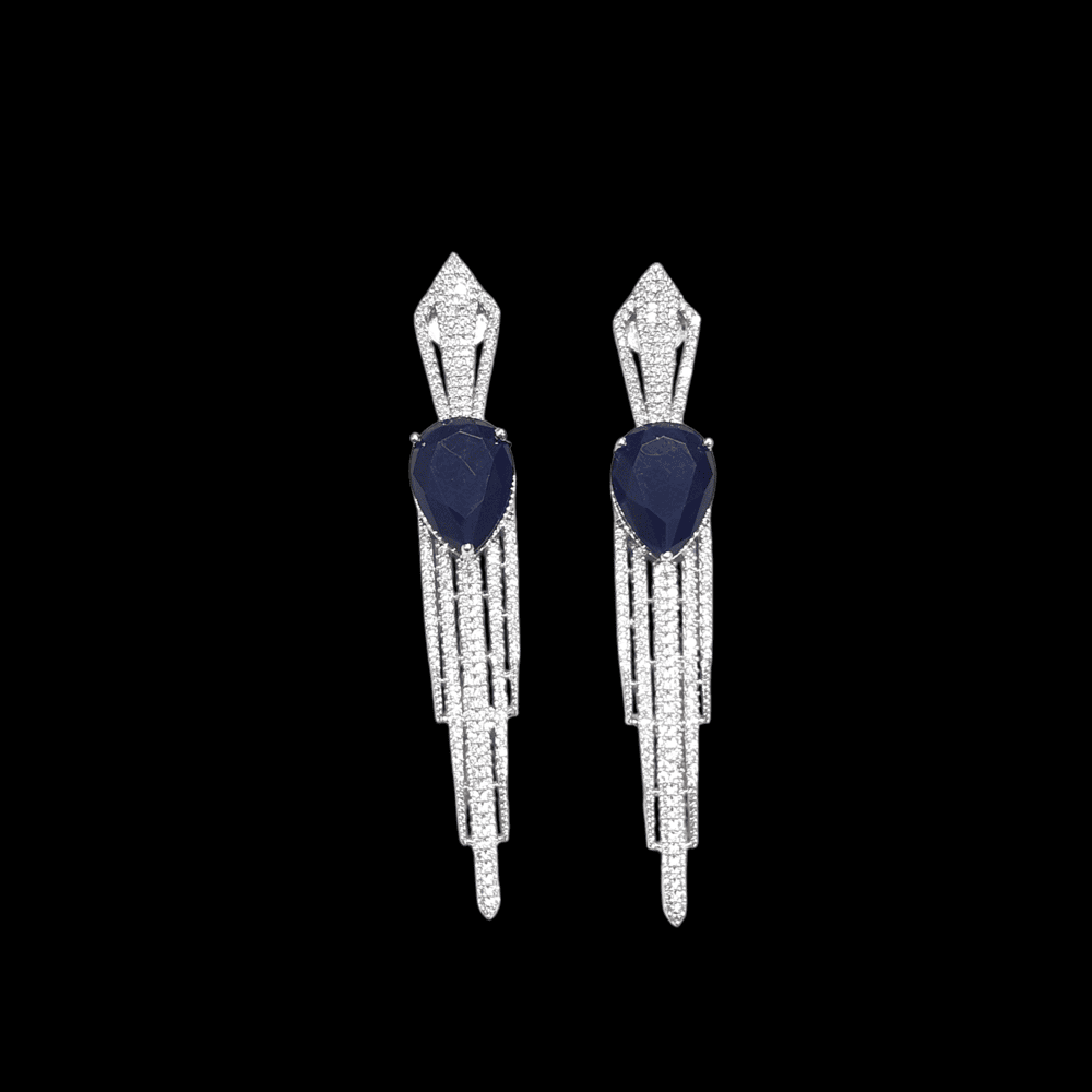 It features a unique and romantic design, described as a drop earring with a prominent Sapphire Blue gemstone (Cubic Zirconia) and intricate detailing with what appears to be high carbon diamonds or rhinestones.