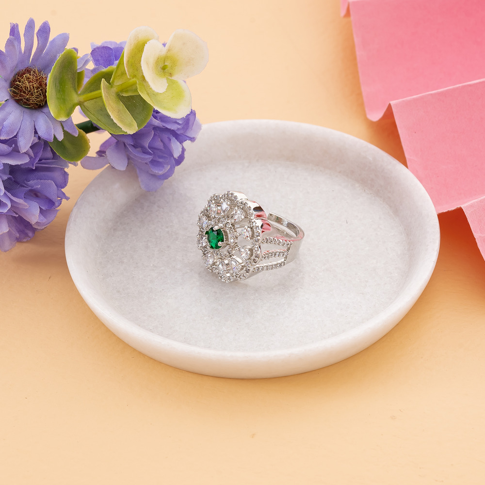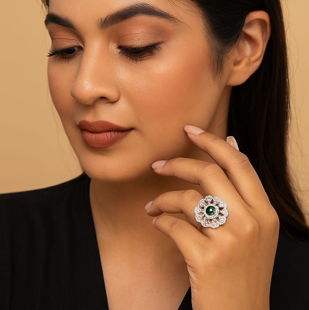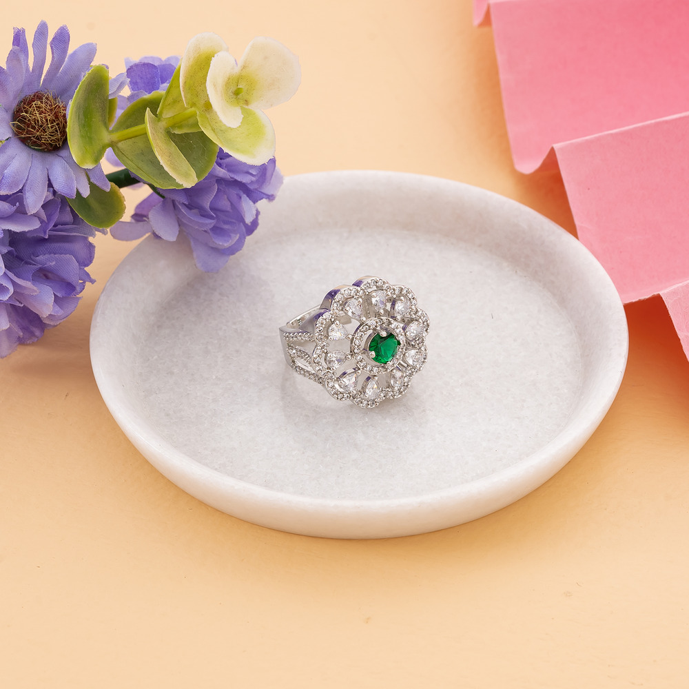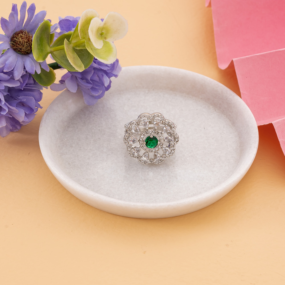 A flower-shaped design with a Emerald Green center stone surrounded by clear stones, cubic zirconia, arranged in a floral pattern.