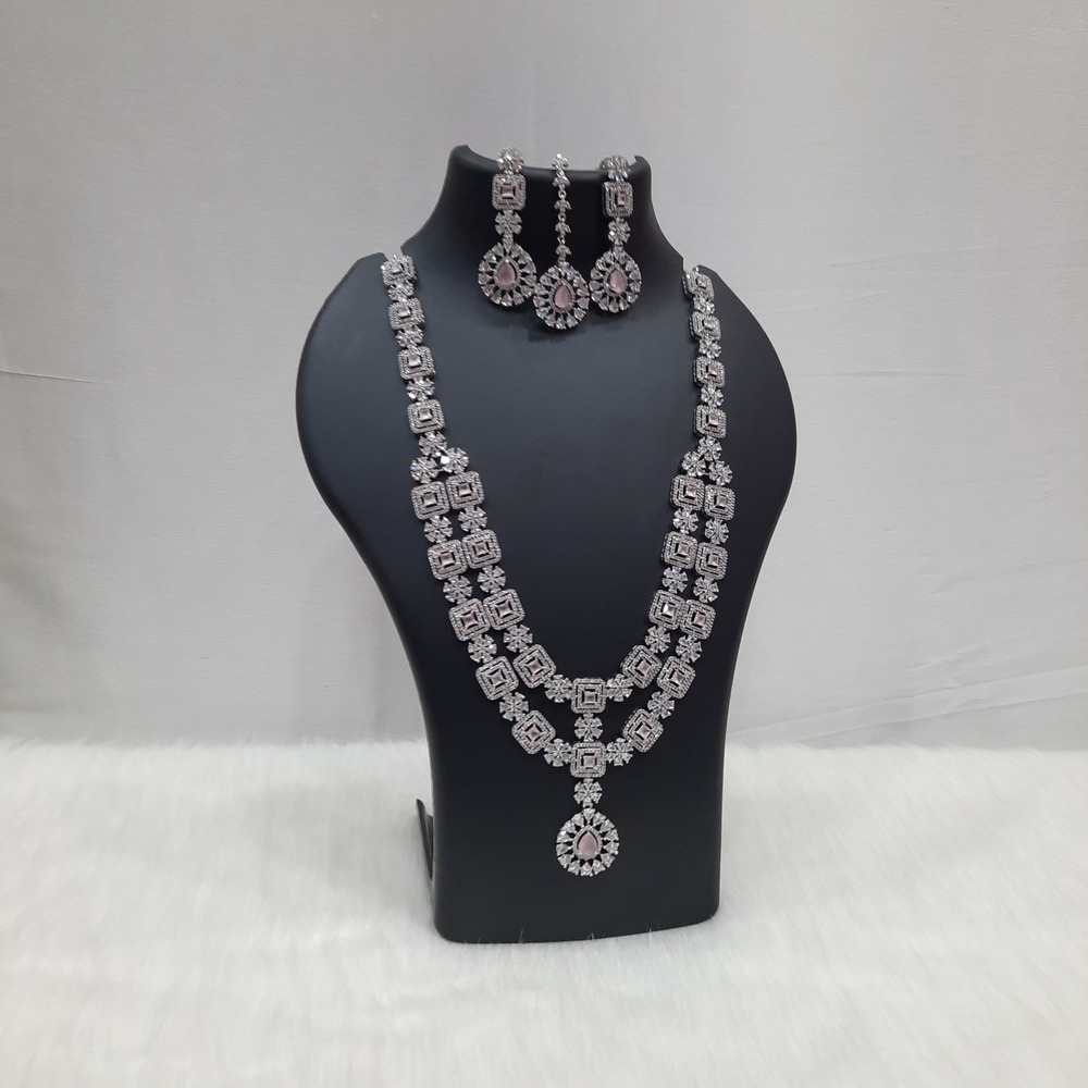 The necklace is a 2(two)-layered design with intricate patterns, incorporating both clear AD stones and the striking Pastel Pink stones, especially in a dangling pendant.