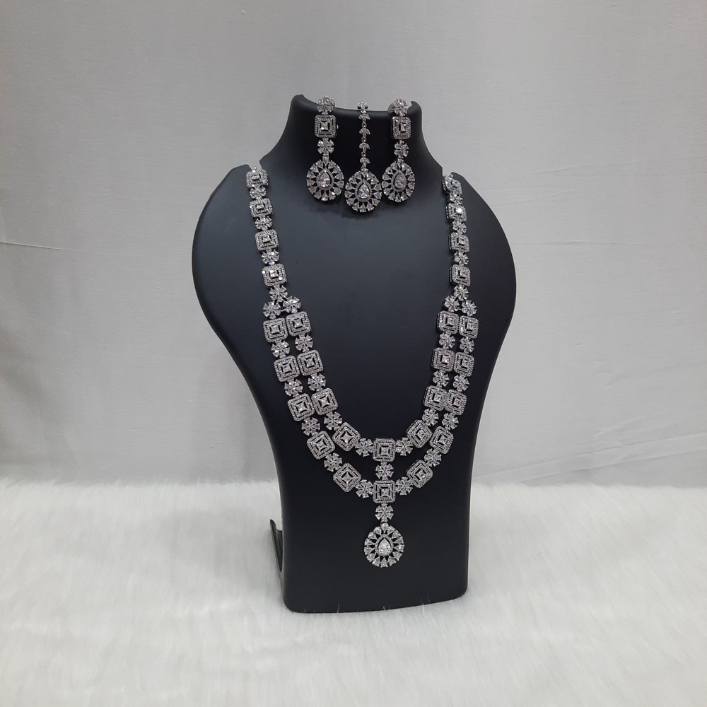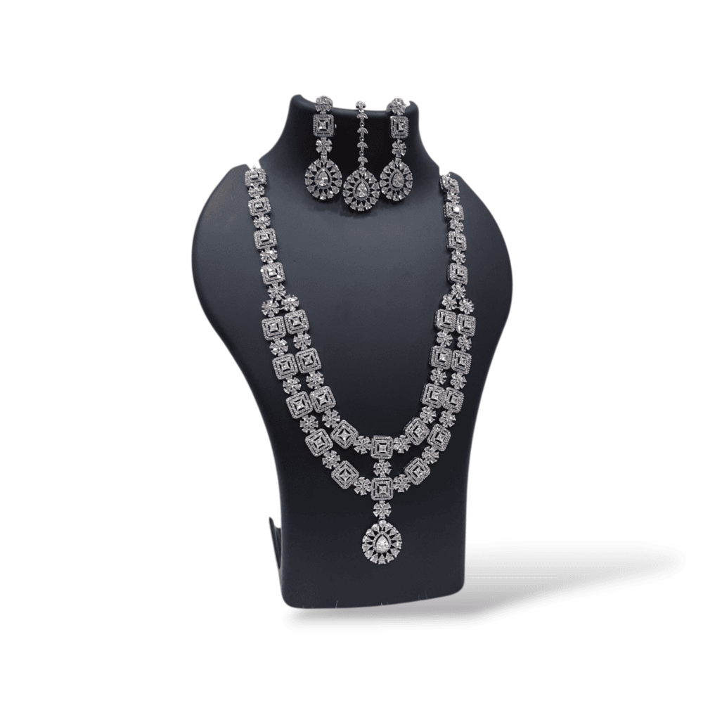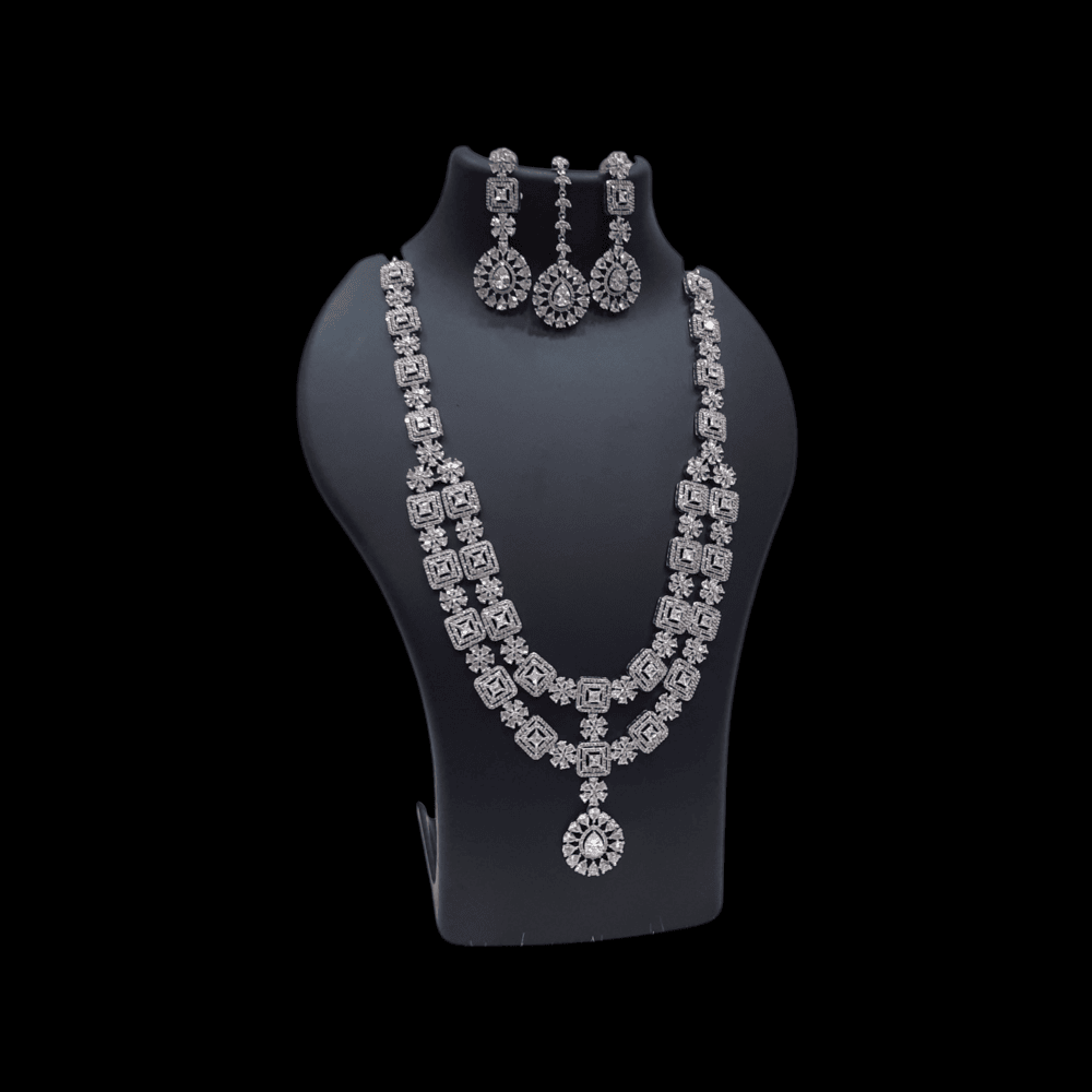 The necklace is a 2(two)-layered design with intricate patterns, incorporating both clear AD stones and the striking White stones, especially in a dangling pendant.