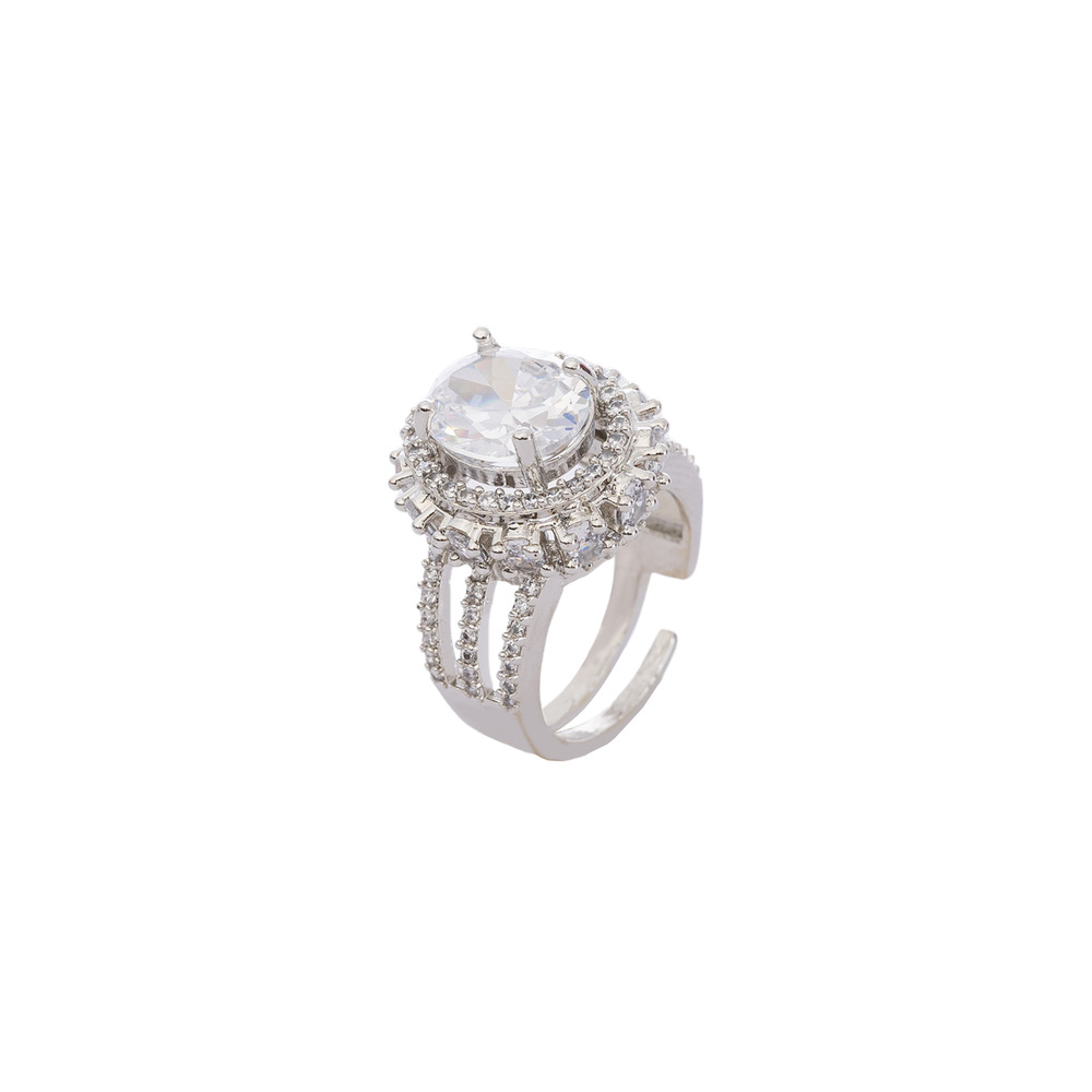 The ring has a prominent oval-shaped White center stone set in a prong setting. This main stone is encircled by a halo of smaller white stones, and the split-shank band is also adorned with these smaller stones.
