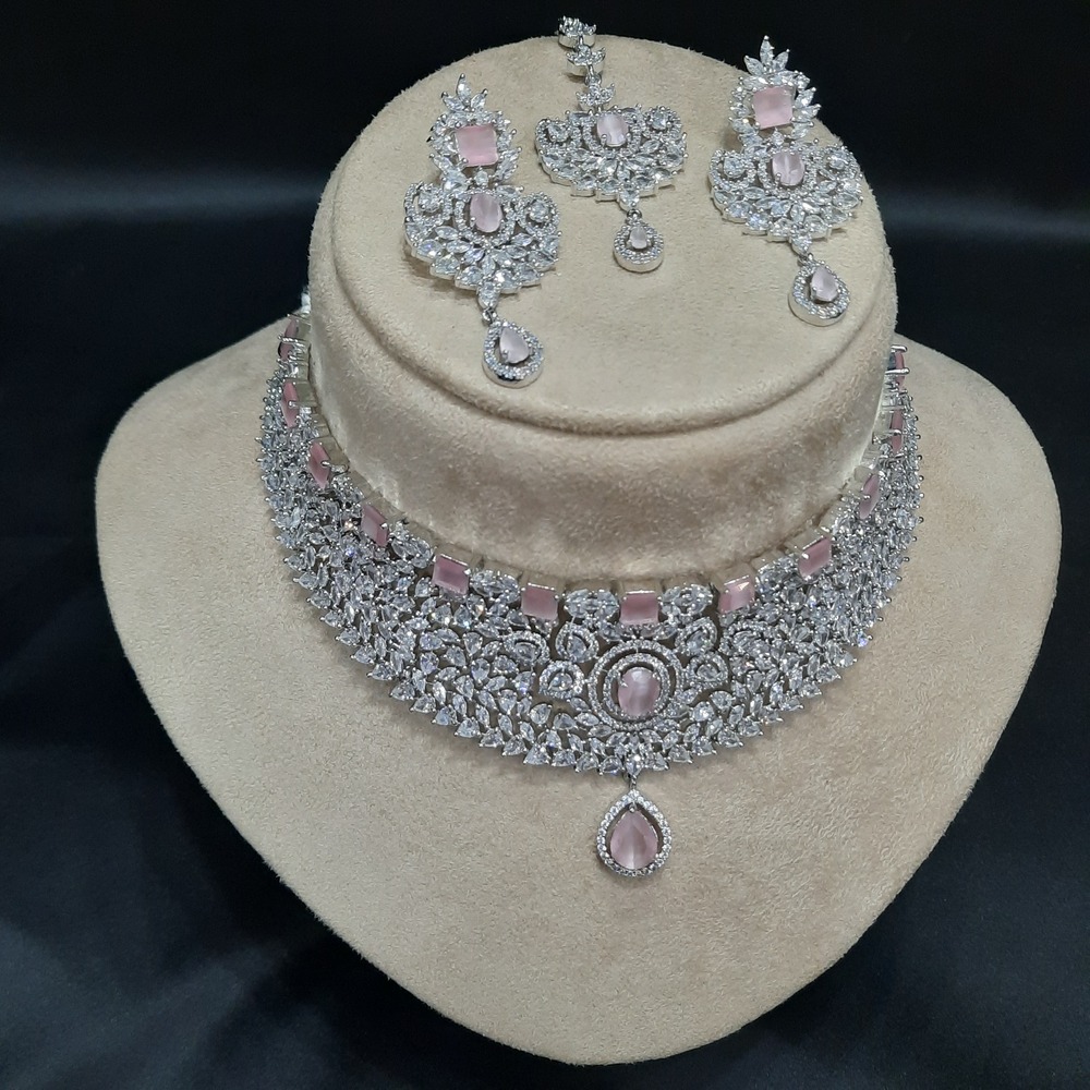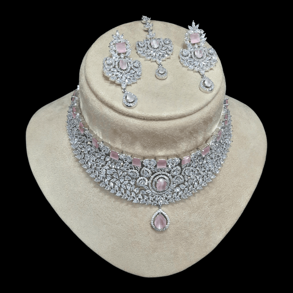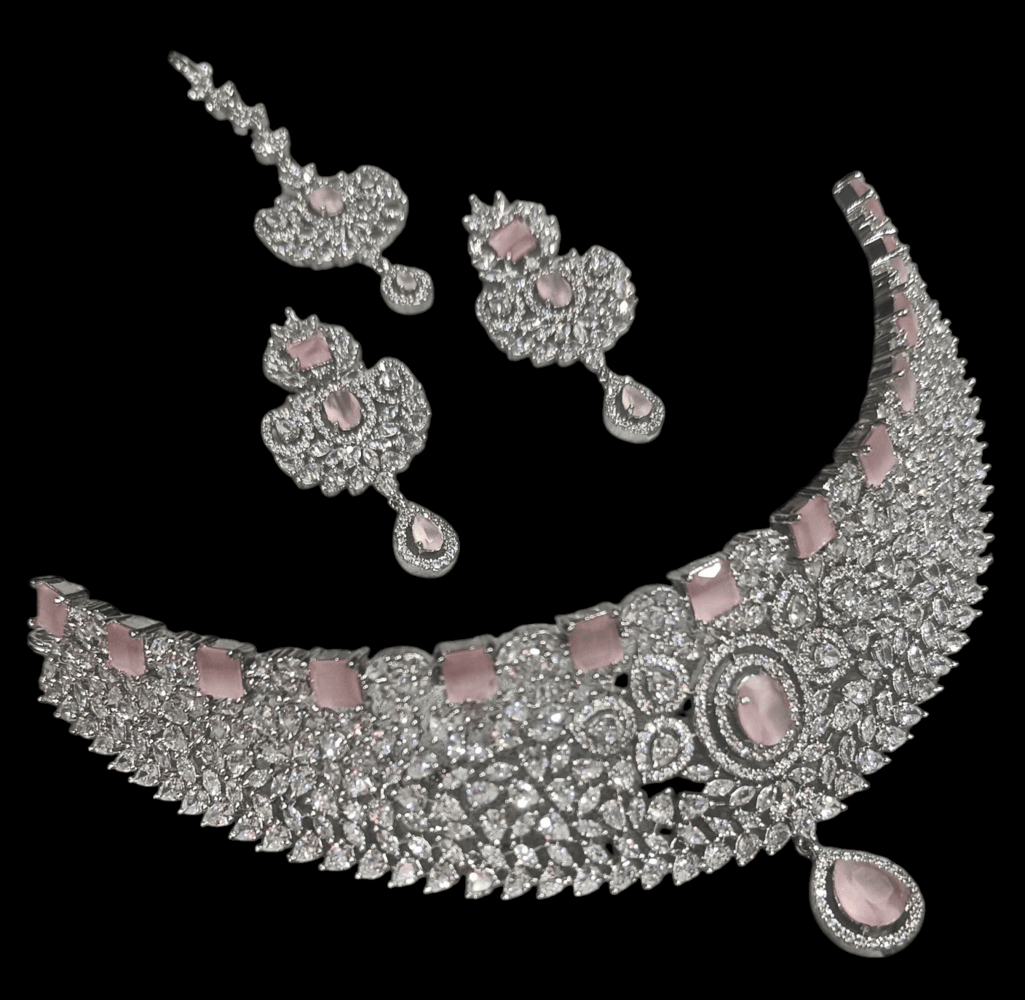 This set includes a necklace, matching earrings and a maang tikka, all adorned with American Diamonds (cubic zirconia) are crafted to mimic the brilliance and sparkle of natural diamonds, offering a more affordable alternative. The set in the image features a prominent Pastel Pink stone accent, adding a pop of color to the otherwise white American Diamond setting. Such sets are popular for various occasions, including weddings, parties, and festive events.