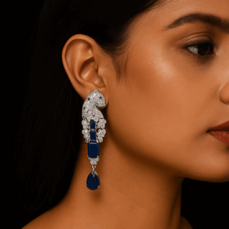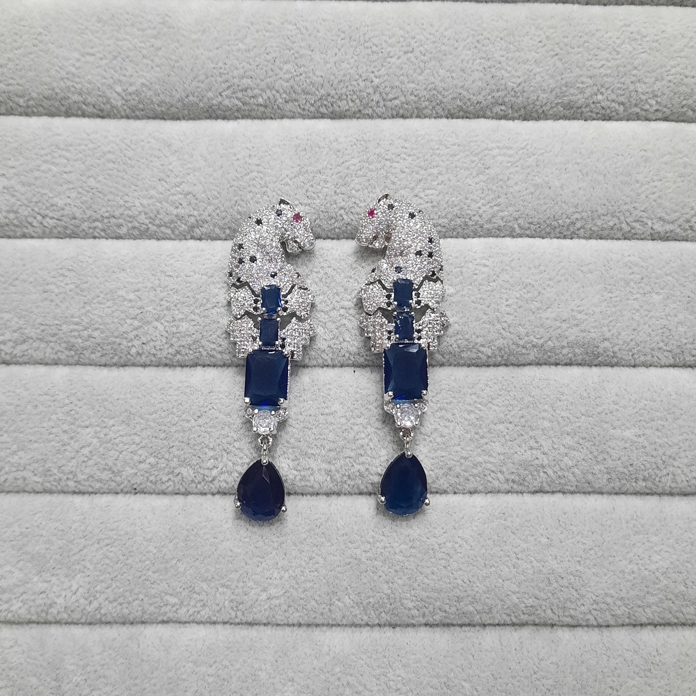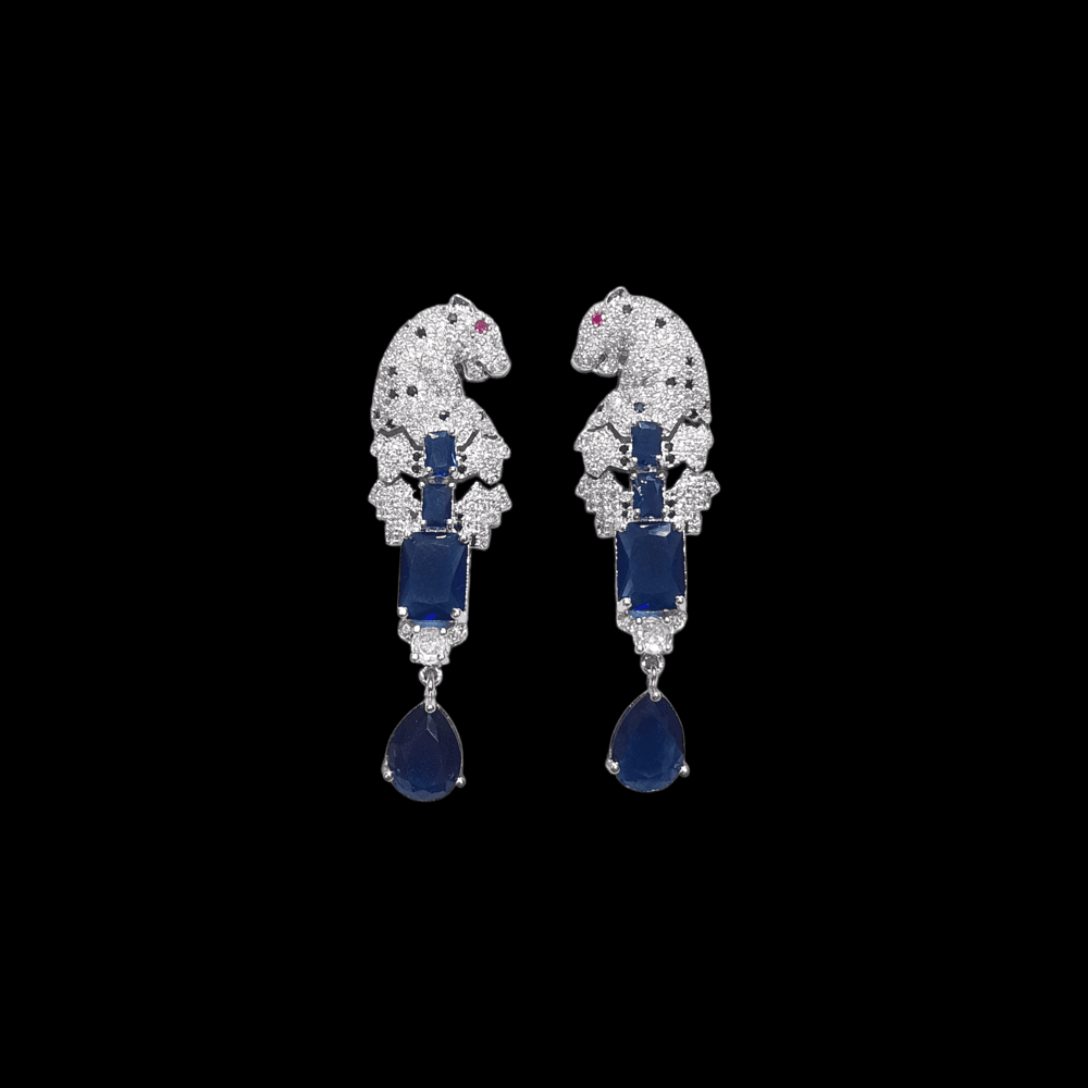 It features a unique and romantic design, described as a drop earring with a prominent Sapphire Blue gemstone (Cubic Zirconia) and intricate detailing with what appears to be high carbon diamonds or rhinestones.