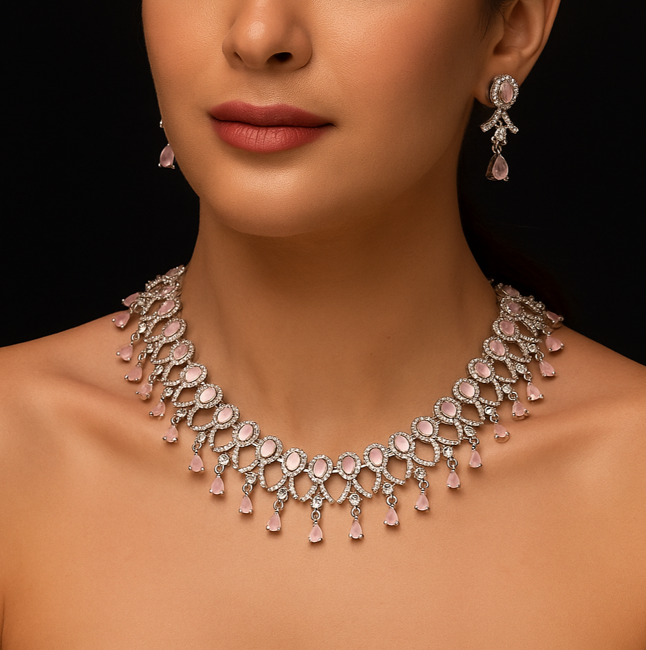 This Pastel Pink Cubic Zirconia Necklace set features a stunning American Diamond Necklace and a sparkling Cubic Zirconia Necklace. Made of high-quality AD Jewellery, this set will add an elegant touch to any outfit. Perfect for any occasion, this set is a must-have for any fashion-forward individual looking for timeless and versatile accessories