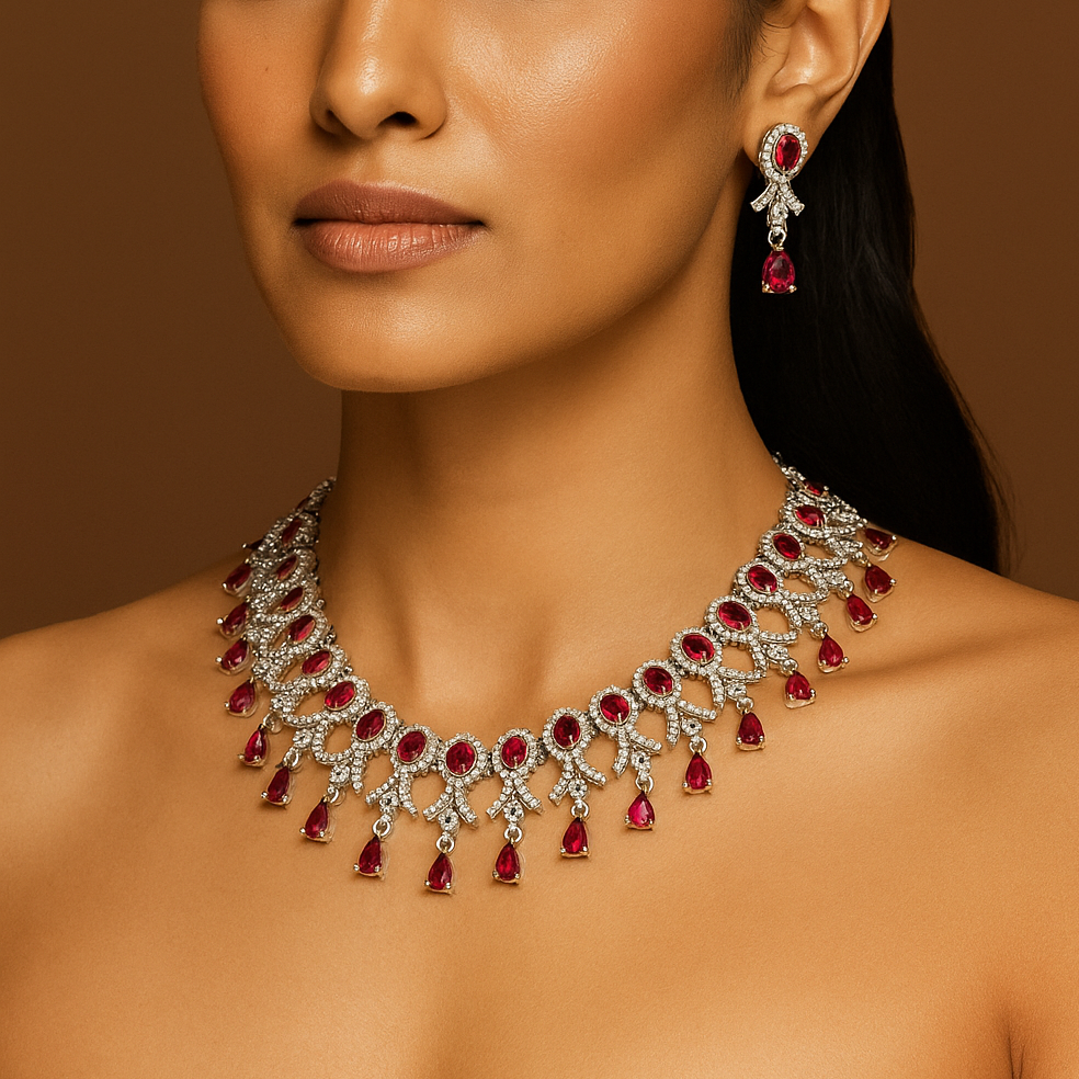 This Ruby Red Cubic Zirconia Necklace set features a stunning American Diamond Necklace and a sparkling Cubic Zirconia Necklace. Made of high-quality AD Jewellery, this set will add an elegant touch to any outfit. Perfect for any occasion, this set is a must-have for any fashion-forward individual looking for timeless and versatile accessories